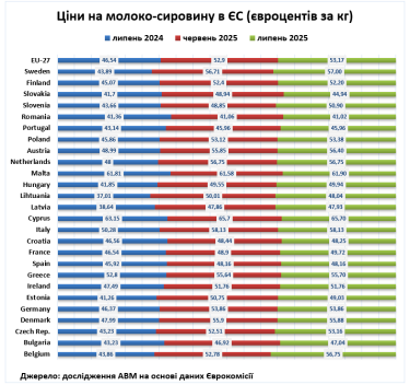 Відносно червня ціна на молоко-сировину підвищилась в 12 країнах-членах ЄС. Серед великих виробників і експортерів молочної продукції, ціни на сировину збільшилися у Франції до 49,72 євроцентів за кг (+1,7%) та у Польщі до 53,38 євроцентів за кг (+0,5%) відносно червня 2025 року. Найбільше подорожчало молоко у Бельгії до 56,75 євроцентів за кг (+7,5%) та Словенії до 50,90 євроцентів за кг (+4,2%).