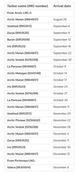 Також видання надало перелік танкерів, які доставили вантаж на Beihai LNG, із вказанням дат прибуття, отриманий із даних Kpler: