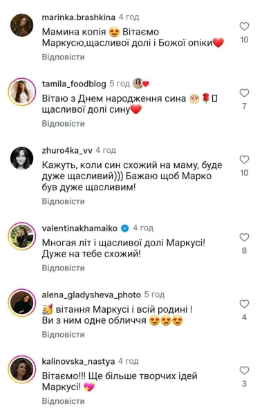 - “Кажуть, якщо син схожий на маму, буде дуже щасливий.Бажаю щоб Марко був дуже щасливим”;