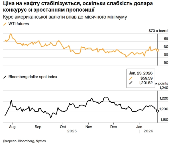 На 23 січня ф’ючерси на нафту марки West Texas Intermediate (WTI) торгуються неподалік відмітки $60 за одиницю, відображаючи тенденцію до п’ятого безперервного тижневого росту. Brent зберігається на рівні приблизно $64 за барель. Помірний долар США зробив нафту більш привабливою для закордонних покупців, що сприяло нейтралізації негативного впливу від збільшення запасів в американських сховищах.