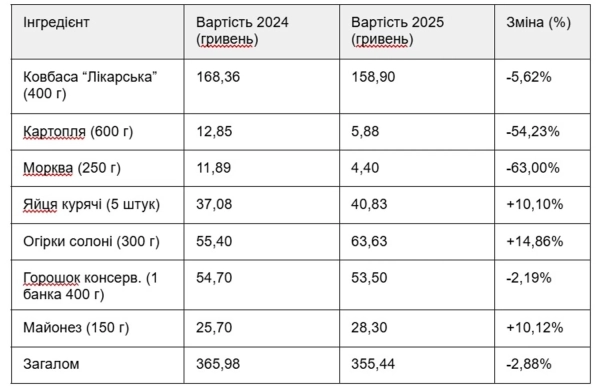 Ціна олів’є у 2025 році дорівнювала 355,44 гривні, що на 3% менше, ніж у 2024 році (365,98 гривні). Слід зауважити, що вартість більшості складників зменшилась