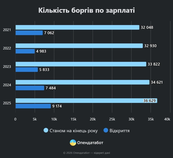Станом на початок 2026 року в Україні, згідно з інформацією Єдиного реєстру боржників, зафіксовано понад 36,6 тисячі випадків заборгованості з оплати праці. Про це інформує УНН, посилаючись на відомості Opendadbot.