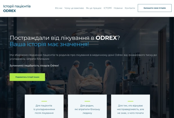 Родини пацієнтів, які відійшли у вічність після терапії в одеській приватній лікарні Odrex, та колишні клієнти, які заявляють про значні ускладнення, започаткували сайт Stop Odrex. Його завдання – згуртувати потерпілих та оприлюднити їхні розповіді, щоб покінчити з мовчанням через острах і домогтися правосуддя.