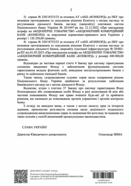 Варто зауважити, що кримінальна справа проти головного юриста НБУ державне бюро розслідувань відкрило наприкінці 2023 року через ймовірне зловживання владою або службовим становищем, що спричинило тяжкі наслідки. Зима, який одночасно є головою адміністративної ради Фонду гарантування вкладів фізичних осіб, втрутився у судові процеси шляхом направлення листа від імені Національного банку України до Фонду. У листі він “рекомендував” відкликати позови, подані проти Нацбанку. Варто зауважити, що головний юрист регулятора просив відкликати позови банку “Конкорд”, подані ще до старту процесу його ліквідації. Позивач в суді планував оскаржити штрафи на суму майже 63,5 мільйона гривень, накладені регулятором.