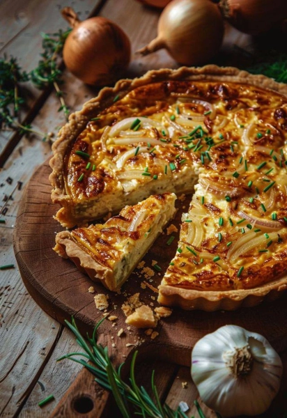 Пікантний та ситний пиріг з плавленими сирками і обсмаженою цибулею.