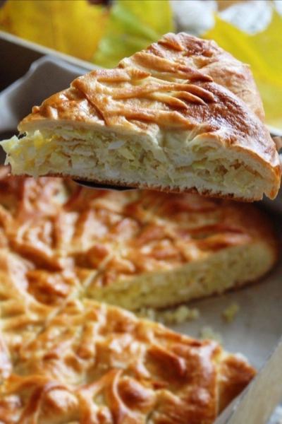 Приготування: Замісити пісочне тісто з борошна, масла, сметани, соди, оцту та солі. Обсмажити цибулю до золотистості. Змішати цибулю, тертий сир, яйця, сіль і перець. Розподілити тісто по деку, викласти начинку, загорнути краї. Випікати 30–35 хв при 180°C.