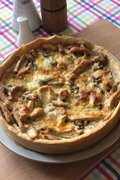 Приготування: Замісити тісто з борошна, солі, розпушувача, кефіру та олії. Дати постояти 30–40 хв. Обсмажити цибулю, додати курку, потім гриби, сметану та борошно. Зняти з вогню. Тісто розкачати, викласти у форму, зробити бортики. Викласти начинку, посипати сиром, випікати 30–40 хв при 180°C.