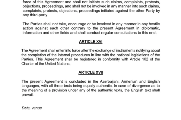 У договорі зазначено, що Вірменія та Азербайджан відмовляються від територіальних претензій один до одного. Зафіксовано відмову від територіальних претензій. Оголошено зобов’язання не вдаватися до сили, втручання у внутрішні справи не допускається. Водночас країни підтримують встановлення дипломатичних відносин і співпрацю у низці сфер, як-то демаркація кордону, пошуком зниклих безвісти, боротьби з екстремізмом тощо.