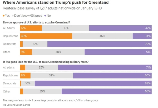 • Збройна сила: переважна більшість американців (71%) вважають “поганою ідеєю” застосування армії для приєднання острова. Лише 4% підтримують настільки радикальний крок.