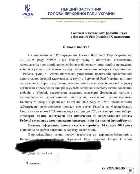 Парламентські фракції та групи отримали пропозицію надати по два делегата до робочої команди. Її завданням буде підготовка до організації виборчого процесу в специфічних обставинах та/або післявоєнних виборів в Україні.