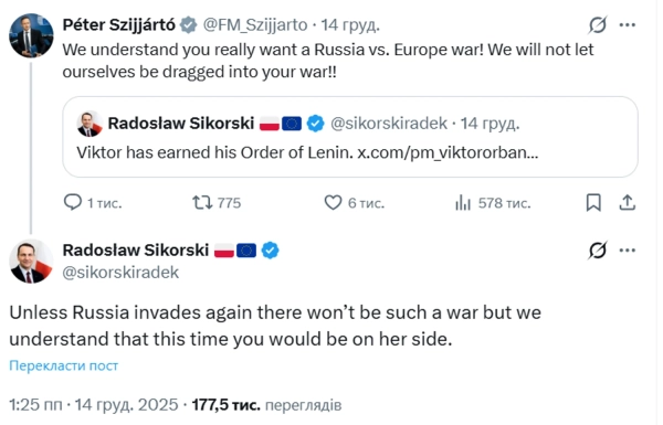 Міністр закордонних справ Угорщини Петер Сійярто відповів на допис Сікорського і заявив, що Угорщина не дасть “втягнути себе у війну” Європи з рф.