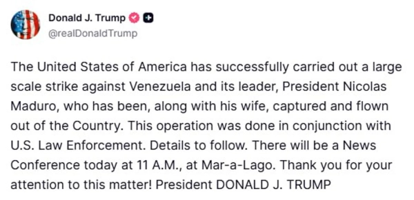 “Американські Штати успішно завершили широкомасштабну акцію проти Венесуели та її керівника, президента Ніколаса Мадуро, який разом зі своєю половинкою був взятий під варту та евакуйований з країни”, – зазначив Трамп.