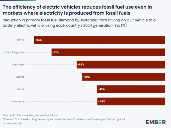 На фоні того, як все більше країн переходять на електрокари, вплив на попит на викопне паливо вже відчутний. Електрокари втричі ефективніші, ніж автомобілі з двигунами внутрішнього згоряння, а це означає, що вони забезпечують значне скорочення споживання нафти навіть у країнах, які досі значною мірою залежать від викопного палива для виробництва електроенергії. У Бразилії, де електроенергія здебільшого чиста, електрокари з електричним двигуном скоротили попит на викопне паливо приблизно на 90%. В Індонезії цей показник скоротився майже вдвічі.