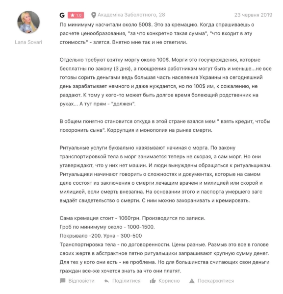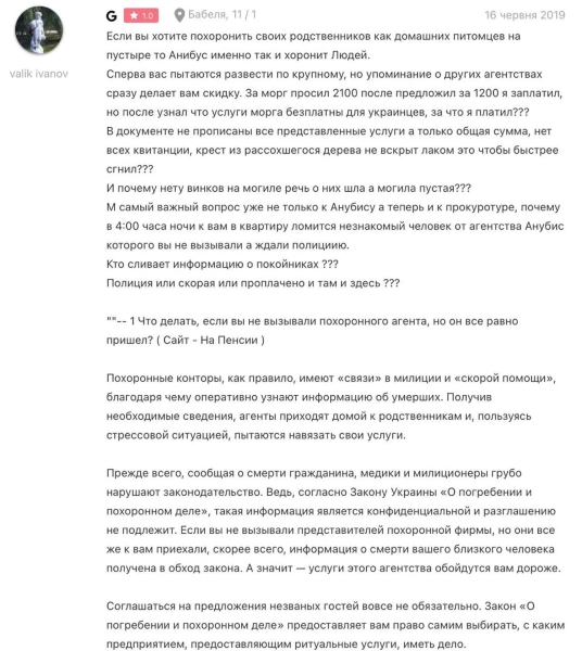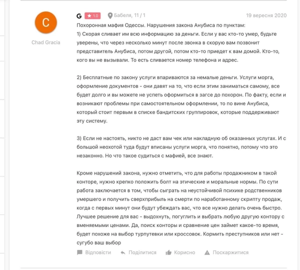 У відгуках про діяльність “Анубіса” в Одесі клієнти розповідають про те, що о четвертій ранку до них приходив представник похоронного дому і в напруженій ситуації нав’язував свої послуги. Вони не виключають, що відомості про померлих похоронному дому “зливають у поліції чи швидкій допомозі”.