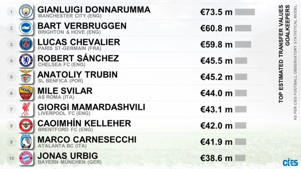 Найдорожчим у списку став страж воріт збірної Італії та англійського “Манчестер Сіті” Джанлуїджі Доннарумма (73,5 млн).