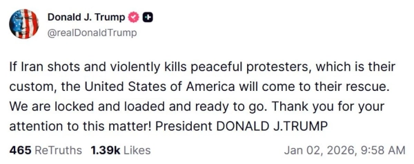 Якщо Іран, як завжди, почне стріляти і жорстоко вбивати мирних демонстрантів, Сполучені Штати Америки прийдуть їм на допомогу. Ми готові до заходів