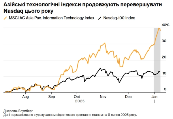 Азійські технологічні лідери розпочали 2026 рік з вражаючого поштовху, засвідчивши суттєву перевагу над американськими конкурентами на тлі підйому штучного інтелекту. Провідний технологічний індекс регіону з початку року піднявся на 6%, що втричі більше ніж темпи росту Nasdaq 100. Про це інформує Bloomberg, повідомляє УНН.