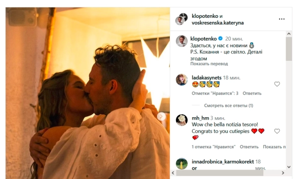 “Здається, у нас є новини P.S. Кохання – це світло. Інформація згодом”, – зазначив Клопотенко, додавши значок обручки.