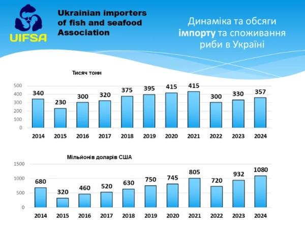 Ключовий висновок від ринку полягає в тому, що українці в цілому не відмовились від риби як продукту. За підсумками 2024 року імпорт склав 357 тис. тонн, а порівняльні показники інших років близькі до цього рівня. У вартісному вираженні спостерігалось збільшення: