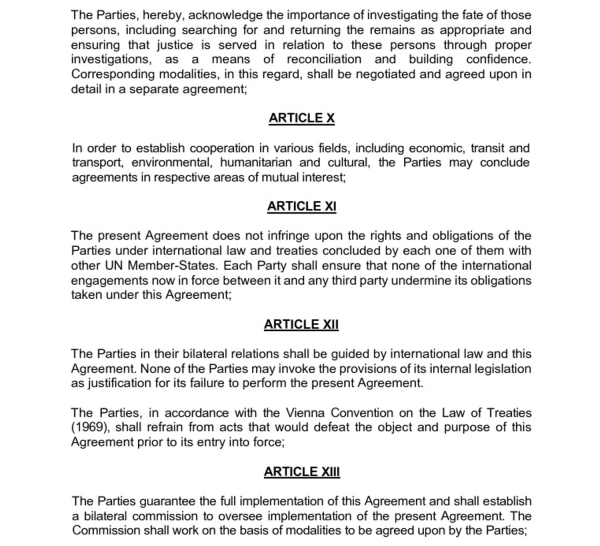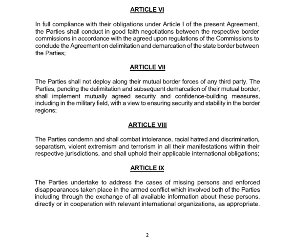 У договорі зазначено, що Вірменія та Азербайджан відмовляються від територіальних претензій один до одного. Зафіксовано відмову від територіальних претензій. Оголошено зобов’язання не вдаватися до сили, втручання у внутрішні справи не допускається. Водночас країни підтримують встановлення дипломатичних відносин і співпрацю у низці сфер, як-то демаркація кордону, пошуком зниклих безвісти, боротьби з екстремізмом тощо.