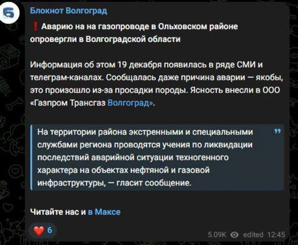 19 грудня у волгоградській області рф стався збій у роботі магістрального газогону “Центральна Азія – Центр” через “осідання ґрунту”. Постачання газу припинено на невизначений період, а ГУР МО України вказує на схильність до посилення геологічних явищ поблизу об’єктів, що забезпечують фінансування війни.